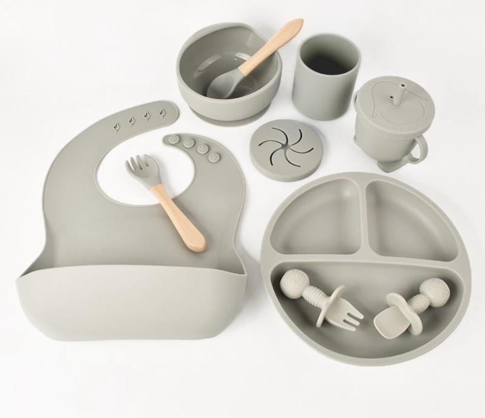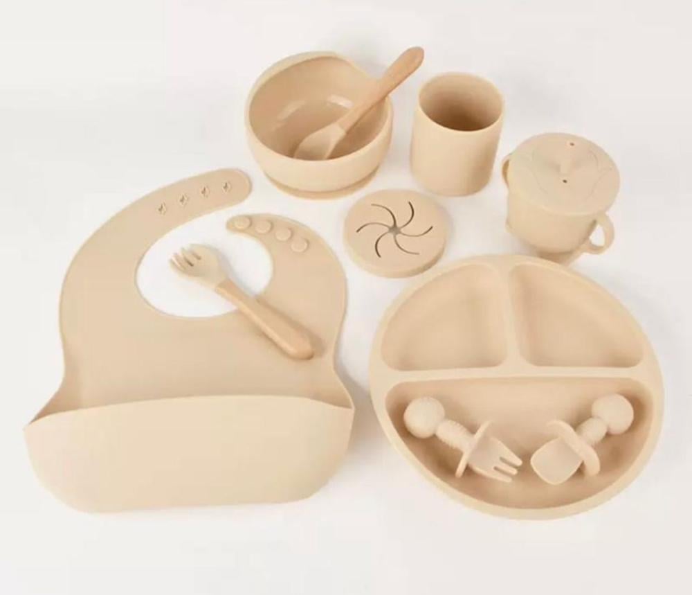 صحون، وملاعق، وأكواب تعليمية، ومرايل، وحافظات طعام، وأدوات تقطيع آمنة جميعها مصممة لتناسب الطفل وتسهل تجربة الأكل.