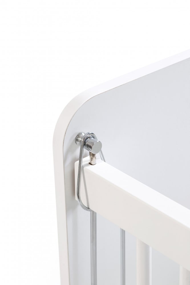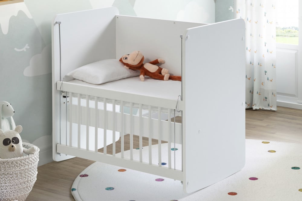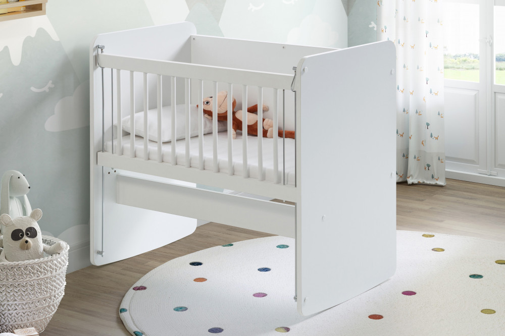 - سرير رضع بتصميم أبيض أنيق يناسب جميع ديكورات الغرف.